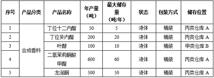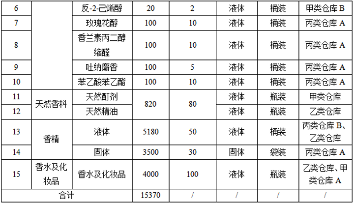 生产规模:本项目主要从事香精香料及化妆品生产,预计年产合成香料1870吨/年,其中叶醇100吨/年、丁位十二内酯50吨/年、丁位癸内酯200吨/年、二氢茉莉酮酸甲酯600吨/年、龙涎酮500吨/年、玫瑰花醇100吨/年、反-2-己烯醇20吨年、香兰素丙二醇缩醛100吨/年、吐纳麝香100吨/年、苯乙酸苯乙酯100吨/年;天然香料820吨/年;香精及化妆品12680吨/年,其中香精(固体)3500吨/年、香精(液体)5180吨/年;香水化妆品4000吨/年,合计15370吨/年香精、香料及化妆品。